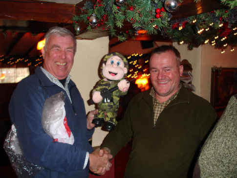 John P presenting Paul F, Sutton Gun Club's chairman, with a windup gift of a walking talking gun toting replica, to remind him of his rough shooting days, and to say thank you for your sterling work as chairman over the last 2 years and the year to come.